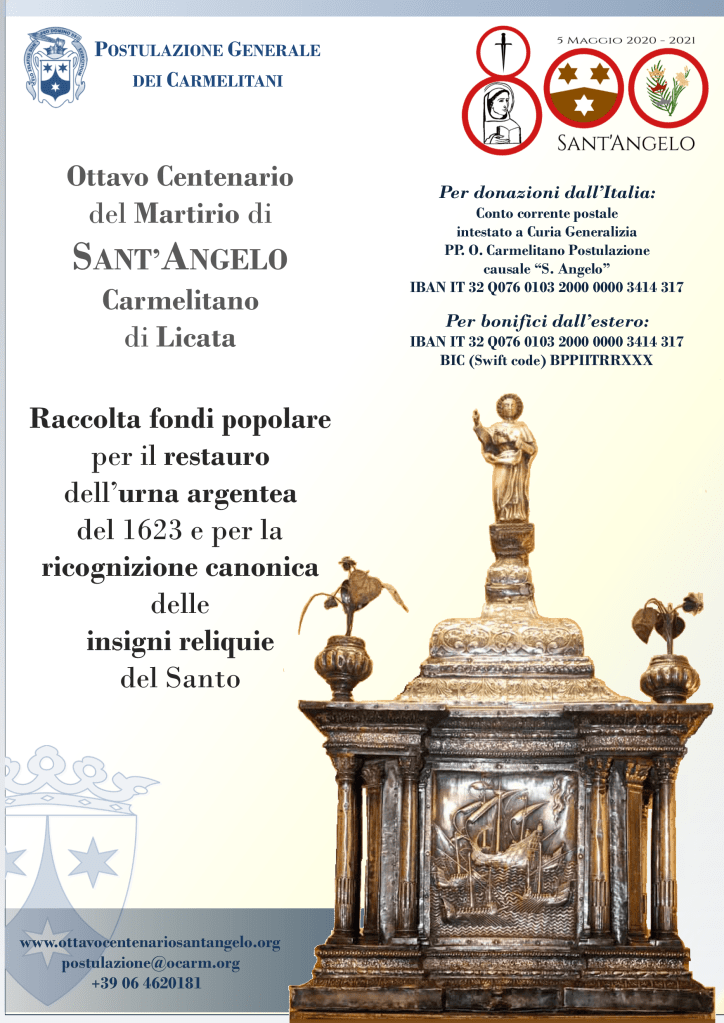La Postulazione Generale dell’Ordine Carmelitano, nel contesto delle celebrazioni per l’Ottavo Centenario del Martirio di Sant’Angelo, in accordo con Sua Em.za il Sig. Cardinale Francesco Montenegro – Arcivescovo Metropolita di Agrigento e la Curia Agrigentina, ha avviato una raccolta fondi popolare per il restauro dell’urna reliquiaria in argento realizzata nel 1623 e custodita presso il Santuario Diocesano del Santo a Licata in Sicilia. Nel corso del restauro dell’opera d’arte si procederà dopo circa quattro secoli anche con la ricognizione canonica delle insigni reliquie del Santo Martire, Padre dell’Ordine Carmelitano.